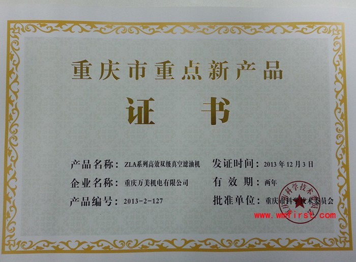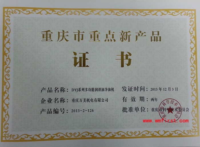 熱烈祝賀,我公司的“DYJ系列多功能潤滑油凈油機(jī)”、“ZLA系列高效雙級真空濾油機(jī)”經(jīng)重慶市科學(xué)技術(shù)委員會相關(guān)專家的鑒定,榮獲重慶市科學(xué)技術(shù)委員會頒發(fā)的重慶市重點新產(chǎn)品證書。而在此之前,我公司的這兩個系列的凈油機(jī)(濾油機(jī))就已是專利及高新技術(shù)產(chǎn)品。此外,我公司還有多款濾油機(jī)擁有專利和高新技術(shù)產(chǎn)品稱號。