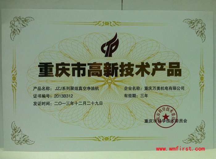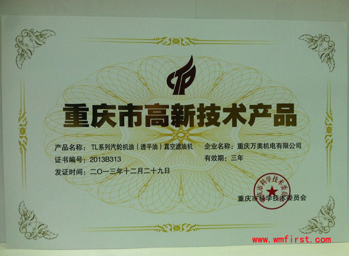 暨上次“DYJ系列多功能潤滑油凈油機”和“ZLA系列高效雙級真空濾油機”獲重慶市科學技術(shù)委員會頒發(fā)的重慶市重點新產(chǎn)品證書之后,我公司的兩項真空濾油機:JZJ系列聚結(jié)真空凈油機(濾油機)和TL系列汽輪機油(透平油)真空濾油機獲重慶市科學技術(shù)委員會授予的高新技術(shù)產(chǎn)品稱號!